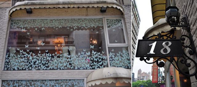 這間以白色系歐式氣息的建築外觀,滿滿的蝴蝶在玻璃窗上紛紛起舞,連門牌都打造的很歐洲風