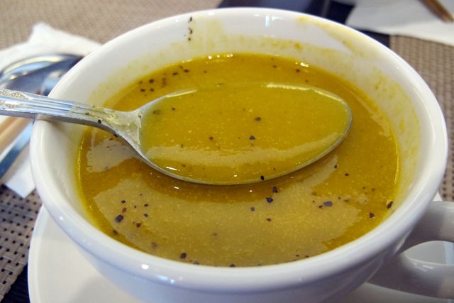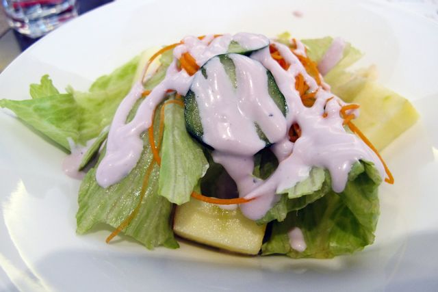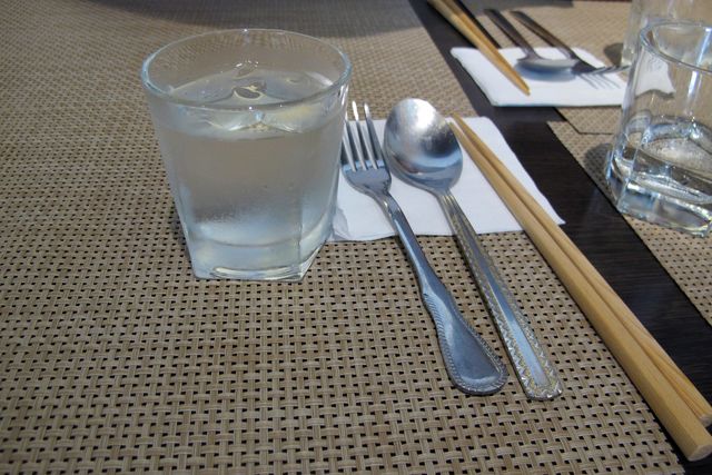 服務生已在桌上擺放好餐具、水杯,桌巾為竹編止滑墊很特別 ↓