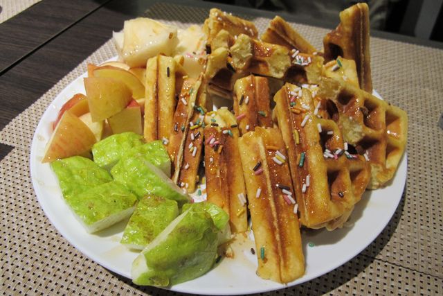 店家招待法式鬆餅及水果拼盤,這鬆餅烤的酥酥脆脆真的超好吃 ↓