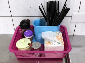 每張桌子上己整齊擺放好餐具及醬料,請自行取用